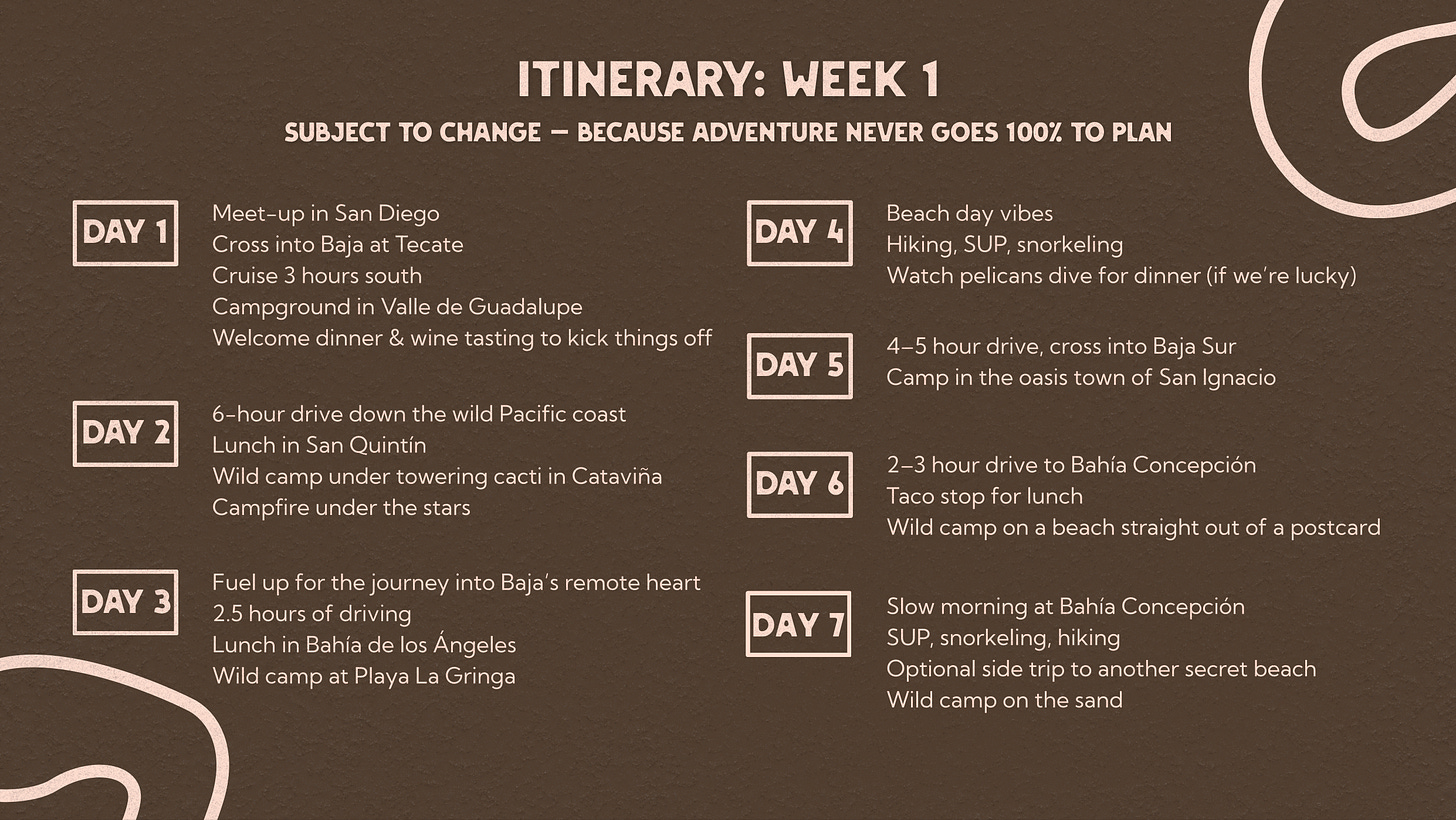 I reworked the trip into a loop that is a lot more balanced now. No burnout. No driving fatigue. I locked in an off-the-beaten-path whale tour that leaves from a quieter town. I’m honestly super stoked with how great this loop is. I personally can’t wait to get back to Baja and do it myself, which is a good sign that I’ve created something others will hopefully love as well.