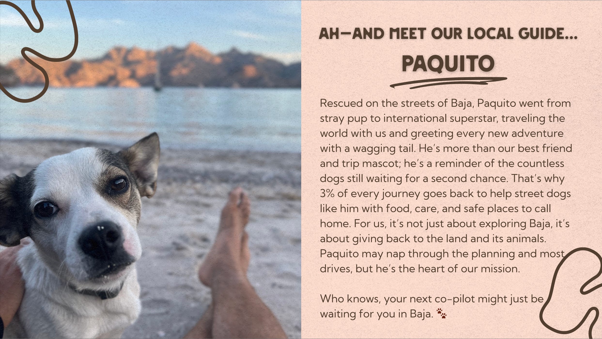 I also included Baja Good’s mission, which is to help the stray dogs in the area. 3% of every trip is donated to organizations helping the doggos, including the place where I adopted Paquito from.