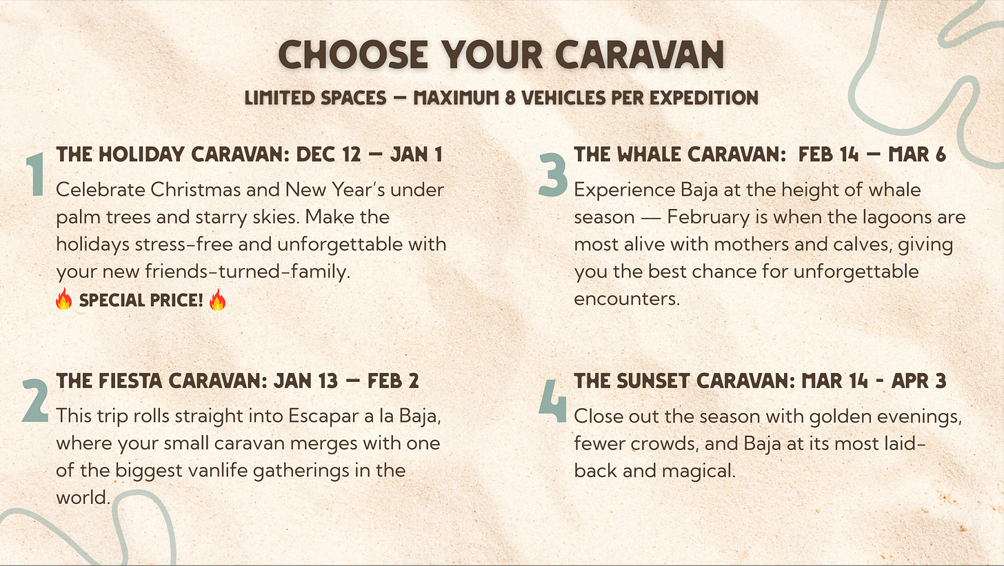 The first one, labeled as the Holiday Caravan, will be dedicated to those nomads wanting to spend the holiday season with new friends-turned-family. My Christmas Eve vegan potluck on the beaches of Baja California Sur shared with four other couples in their vans, buses, and trucks, was one of the best Christmas celebrations I’ve ever had… complete with a bonfire and the sound of crashing waves.